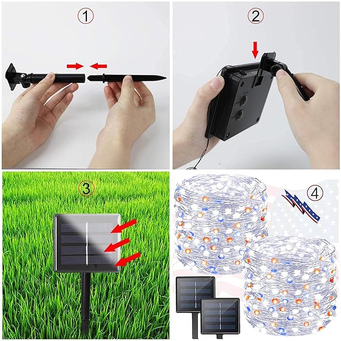 • Widely Used Patriotic Solar Fairy Lights Outdoor : Wonderful 4th of July decoration, garden decor, party decorations, wedding decorations, holiday decorations, Christmas tree, patio, backyard, fence, porch, tree, roof, outside and inside. Outstanding solar patriotic lights outdoor can meet all your needs in various scenes