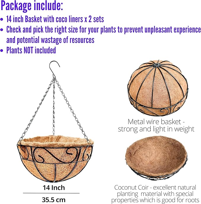• 2-PACK SET: 14 Inch, extra large size. Pick the right size for your plants to prevent unpleasant experience and potential wastage on resources. Flowers and Plants are NOT included. These metal hanging planters are ready to hang with hanging chain and hook. Assembly not required