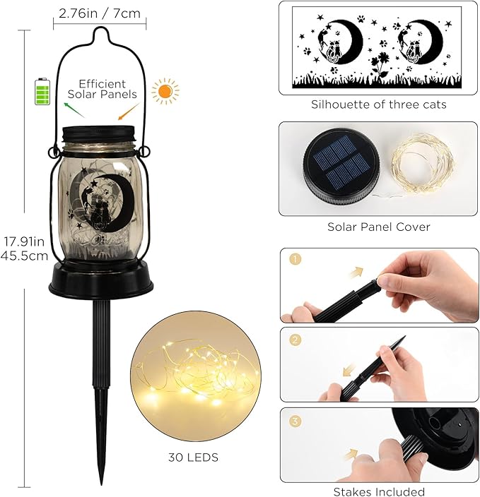 • WEATHERPROOF & EFFICIEN SOLAR POWERED LANTERN: The solar cat lantern charges 6 hours in daylight for 8+ hours of night glow (switch on). IP65 waterproof, it shines through rain, ensuring continuous light. Crafted for durability, its upgraded solar panel stabilizes string lights. Effortless operation: press to activate, auto on/off at dusk/dawn. No electricity, cords, or maintenance needed. Please ensure that the power switch is in the "ON" position when using