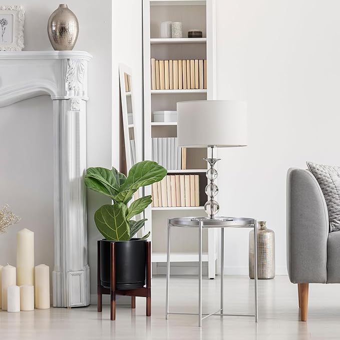 D'vine Dev Ceramic Planter with Walnut Color Stand - 10 Inch Modern Round Flower Pot with Wood Planter Holder, Black, 55-B-X-2