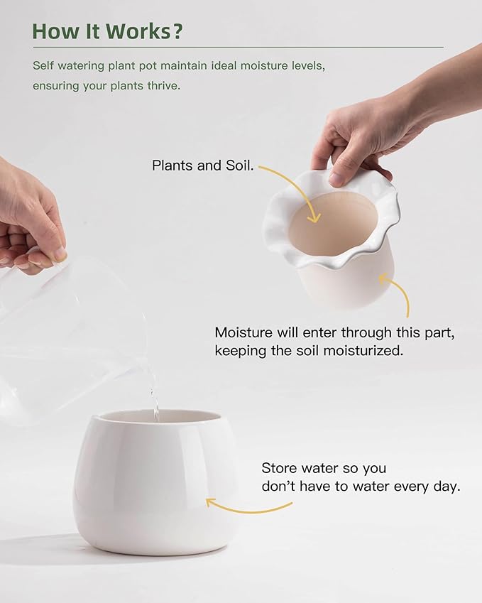 • TIMELESS DESIGN MEETS FUNCTIONALITY - Infuse your home with charm using our self-watering pots. The timeless design, coupled with advanced self-watering technology, creates a synergy of elegance and practicality. Ideal for plant enthusiasts