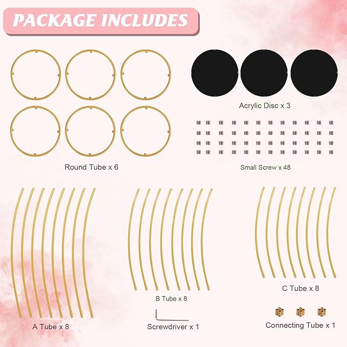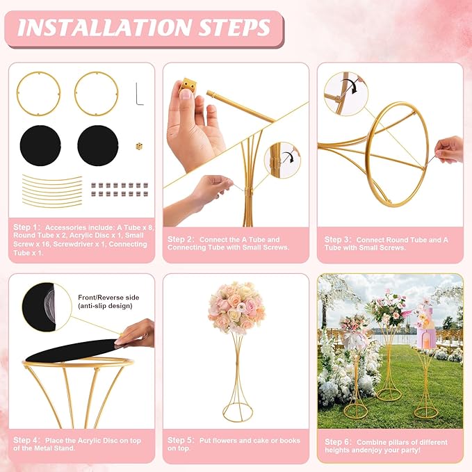 • Sturdy Enough - Thanks to its high-quality materials, this flower stand for weddings is not easy to bend, with stable structure, does not shake, sturdy enough to hold heavy items. Therefore, you can place any decoration you like on the metal plate of the gold flower vase, whether it is a heavy vase, large floral arrangement, light silk flowers, or hanging flower vines, it will hold up well without falling over.