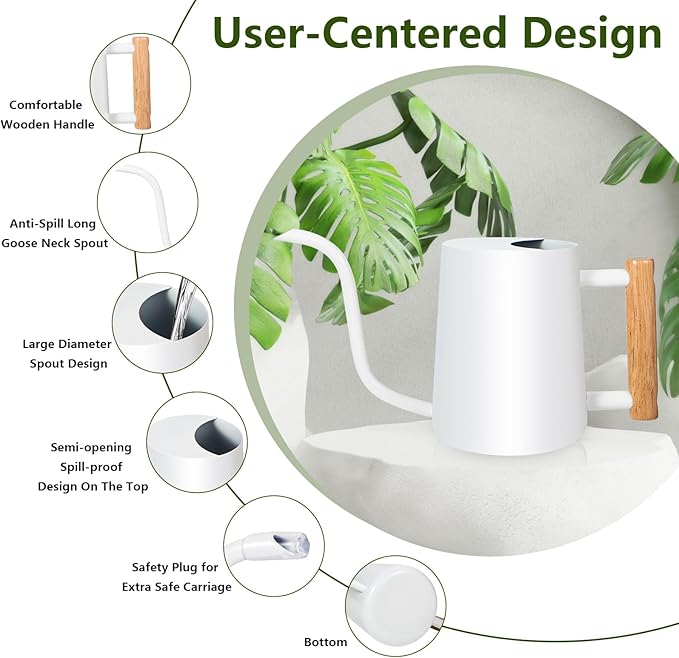 • Premium 304 Stainless Steel Material - Our watering can is made of premium 304 stainless steel The welds around the bottom of the spout and around the two points where the handle connects to the body are attached well and is powder coated, which is leakproof, rust-resistant, scratch resistant and long lasting without fading. The indoor plant watering can seems simple, but it is not, it's not just a gardening tool, but a simple and modern decoration, and well matching various home decor styles