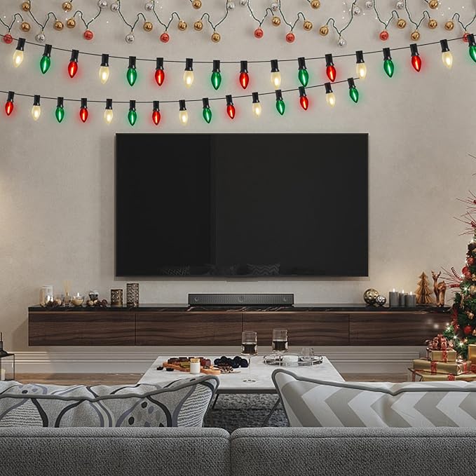 • Led Multicolor Christmas lights: C7 Led multicolor Christmas lights string outdoor with red/green/frosted white bulbs glow naturally warm, creating a vintage effect or antique atmosphere and romantic atmosphere. C7 led Red Green/White Christmas lights Perfect for wedding, birthday, Valentine's Day decoration and lighting.