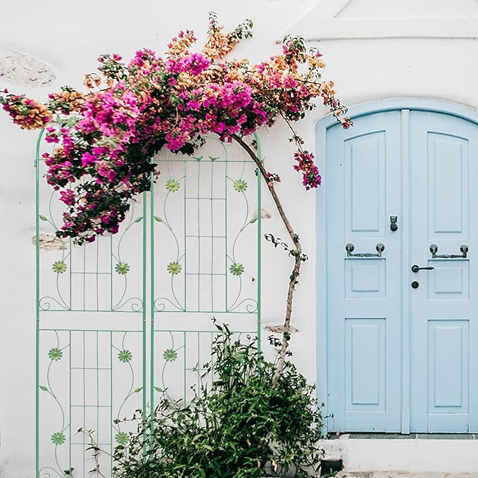 • PLANTS SUPPORTING TRELLIS: This blue green metal garden trellis is perfect for supporting all kinds of flowering trellis plants, wall-climbing vines. It allows them to grow naturally up towards the top.