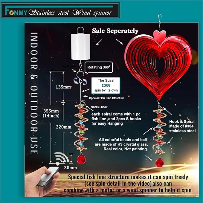 • 【PREMIUM CRYSTAL SUNCATCHER】The spiral with crystal is a special sun catcher rainbow maker, it’s Super Sparkly under sunshine. You can also add a motor(not include) to let the spiral to spin ,while spiral tail rotating (it can’t spin by itself.), the crystal ball seems to move up and down like floating and dancing in air, presents the magical visual illusion.