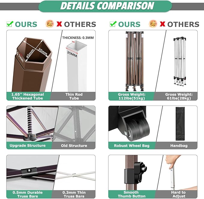 • [Upgrade Heavy Duty Canopy] The COBIZI 10x20 Heavy Duty Canopy features a commercial-grade full truss structure constructed from durable powder-coated stainless steel. The thickness of the 1.77 inch (45mm) hexagonal legs has been increased to 0.7mm/0.03 inches, providing superior stability and durability. Full truss design ensures exceptional sturdiness and rust resistance, capable of withstanding wind speeds of up to 30mph when properly secured with an number of sandbags, ropes, and stakes.