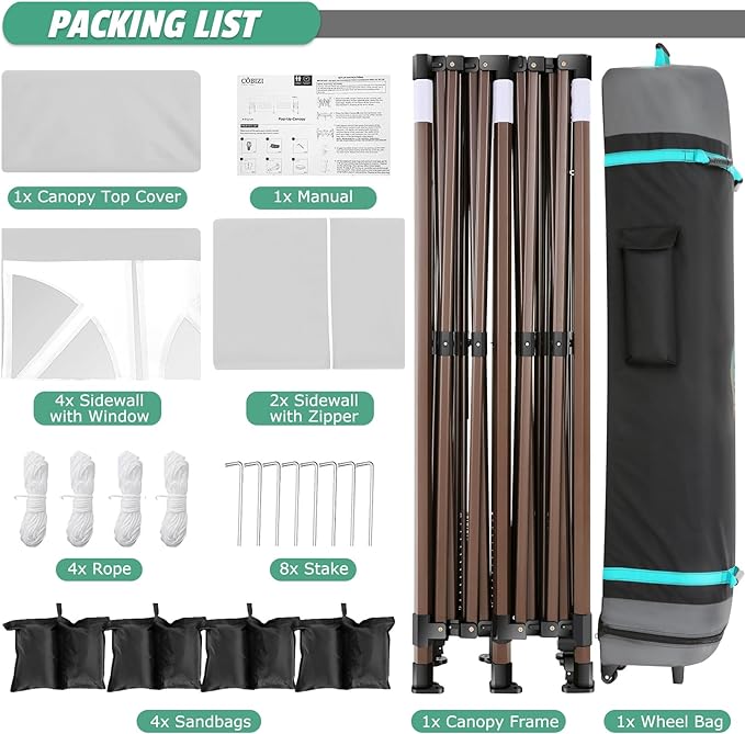 • [Included Accessories] 1x Commercial Grade 10x20 Pop Up Tent Frame, 1x Top Cover, 4x 420D Oxford Fabric PVC Coated Sandbags, 8 x Ground Pegs, 4x Windproof Ropes, 1x Rolling Bags, 1x Manual.If you have some problems and questions, please feel free to contact us, we will give you the best help. Choosing us means choosing a comfortable life.