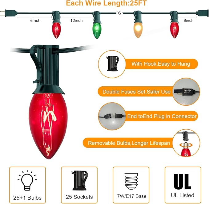 • Effortless Connectivity and Energy-Efficient: Featuring E17/C9 candelabra socket bases, christmas lights red green white are designed for hassle-free end-to-end connection, covering up to 25 feet effortlessly. With 120 Voltage and 7 Watts per bulb, totaling 175 Watts, they are energy-efficient, saving you on electricity costs while brightening up your space.