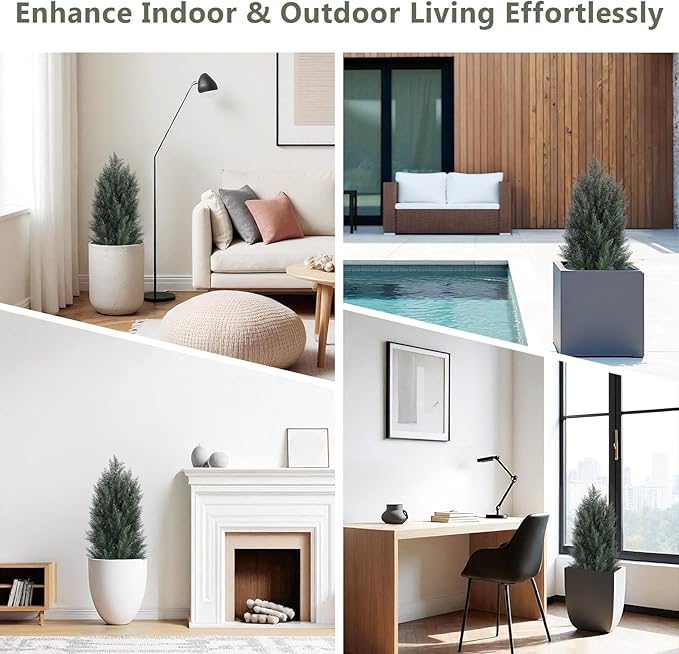 • 【REALISTIC & EVERGREEN LOOK】These cedar topiary trees artificial outdoor feature dense foliage with a natural, sculpted shape that mimics real evergreen bushes. Ideal for outdoor planters, entryways, or patio corners, they offer lifelike greenery that stays vibrant through all seasons. (Note: Branches arrive compressed. Gently shape them by hand for best results.)