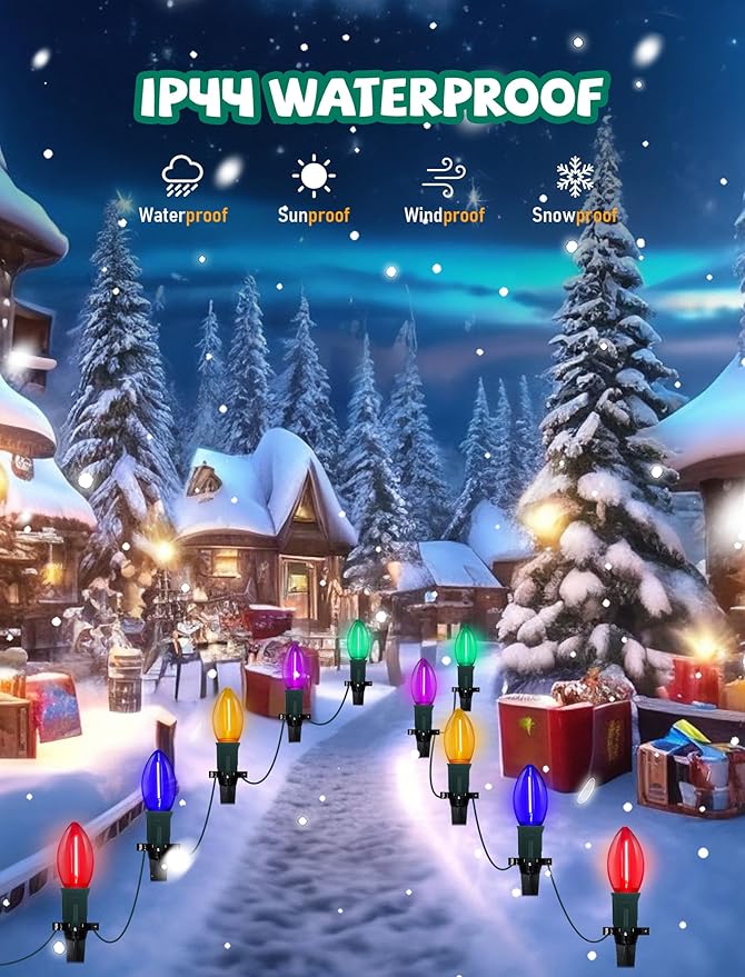 • ✨Practical and waterproof: C9 led multicolor christmas string lights outdoor is hanging and plugging, Hang up C9 colorful string lights around your roofline decor or plug the C9 christmas driveway lights in lawn garden. led christmas pathway string lights is crafted for outdoor use, these lights are built to withstand the elements. They're weatherproof and designed to endure rain, snow, and wind, ensuring they keep shining through the holiday season.