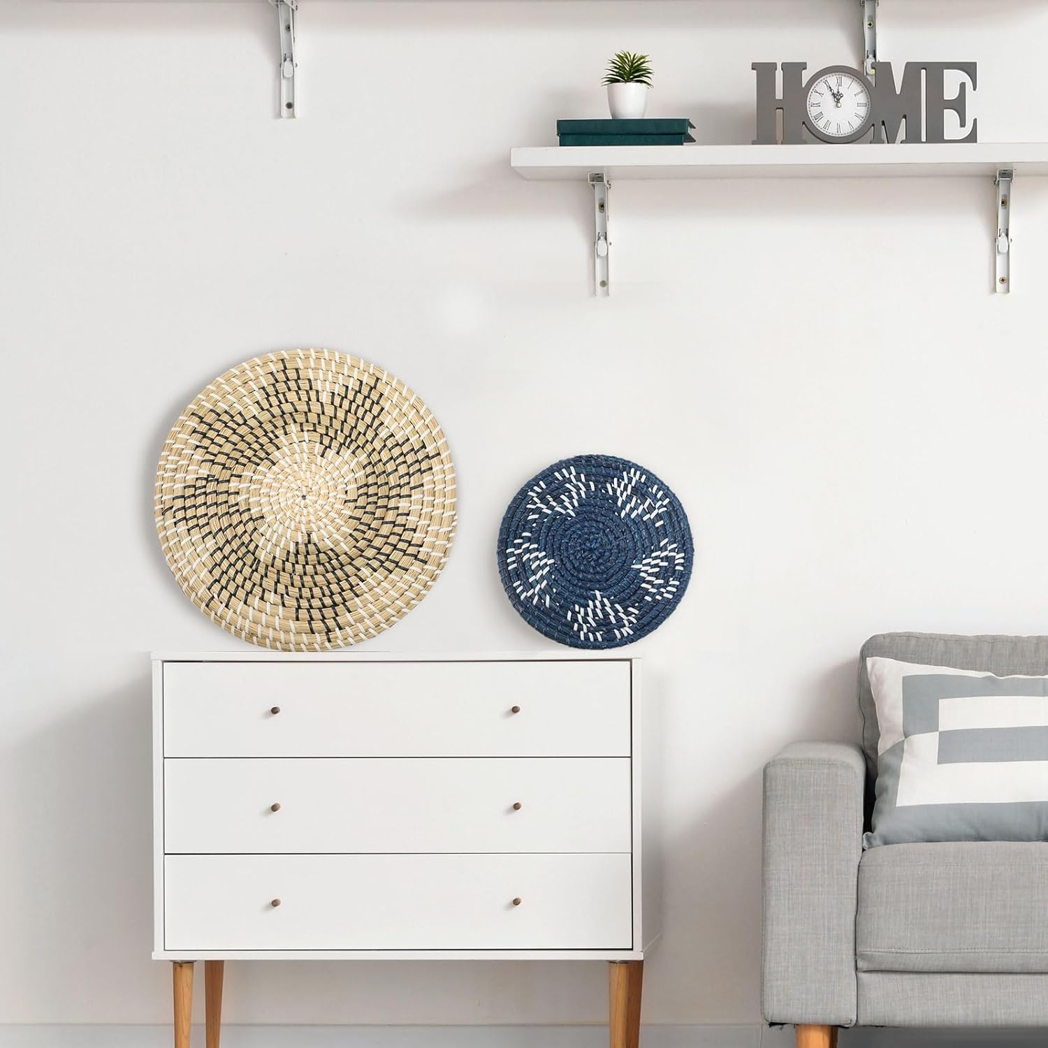 • Delicate Workmanship: woven wall decor is natural and hand woven, made of tan, blue and white plastic cord, neutral colors are easy to match, each seagrass basket is finely handcrafted; When first opened, there will be a natural aroma, which will dissipate in a short time
