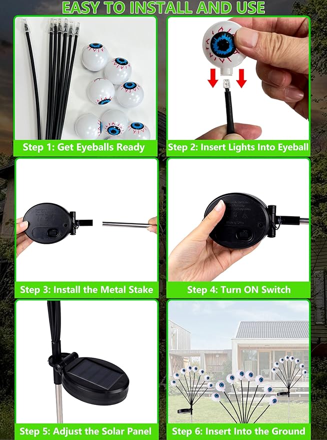 • 【Solar Halloween Lights Kits】Value 4-Piece Set, each include 8 eyeballs, total of 32 horror eyeball LED lights. Emits an eerie green glow that scares and envies your neighbors. One-of-a-kind Halloween outdoor lawn path decorations.
