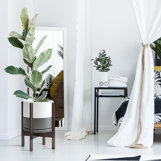 • A Complete Set: Mid-century ceramic planter, combined with a sculptural, solid wood stand that match perfectly together and looks great in anywhere.