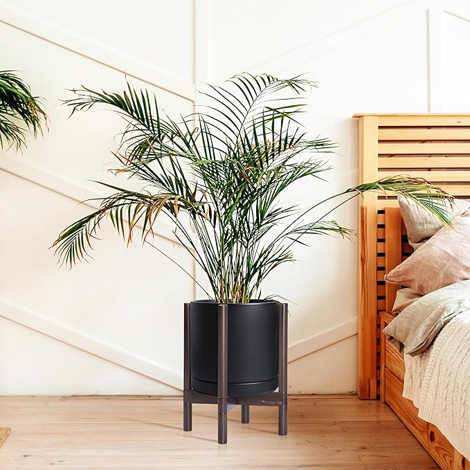 D'vine Dev Ceramic Planter with Walnut Color Stand - 12 Inch Modern Round Flower Pot with Wood Planter Holder, Black, 55-B-W-2