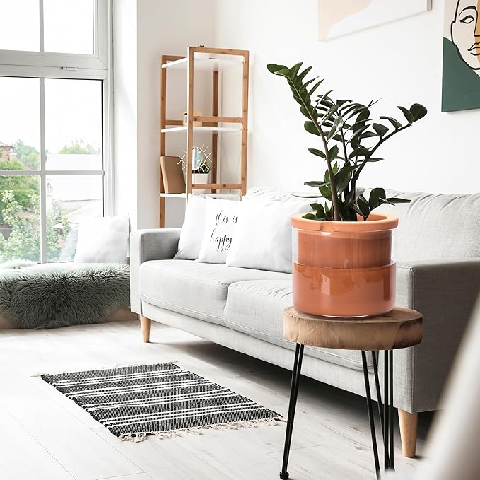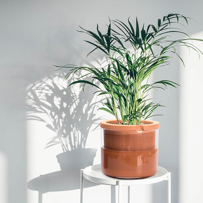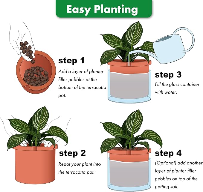 • Self-watering System: The bottom section of the white terracotta pot is unglazed, just fill the glass container with water to ensure plants will absorb only what they need through the terracotta pot walls.