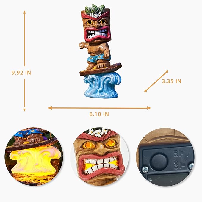 • 【PERFECT GIFT IDEA】The surfing tiki statue is ‎6.1x3.35x9.92inches in size, makes a perfect birthday/mother’s day/Christmas gift for family members, friends,tiki lovers or people who own a garden.It will light up their yard and bring a smile to their faces