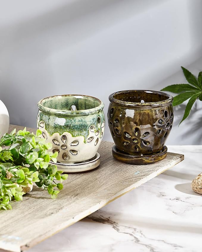 Vensovo 4 Inch Ceramic Orchid Pots with Holes and Saucers - 2 Pcs Small Succulent Pot for Repotting, Garden Flowerpots for Plants Indoor and Outdoor Promotes Air Circulation (Olive Green, Green Mixed)