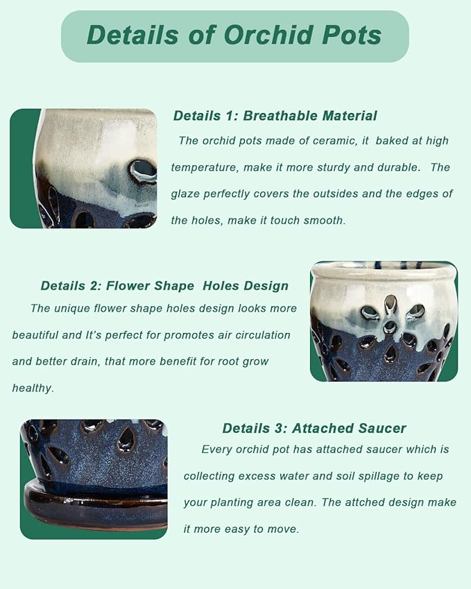 • 【 Perfect Air Flow and Drainage 】 The ceramic orchid pots side body have specially designed multiple holes for promotes air circulation and it has drainage hole in the bottom help for better drain and benefit for root grow healthy. Orchid pot with attached saucer could collect excess water keep your planting place cleaning.
