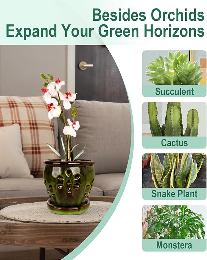 • 【 Perfect Air Flow and Drainage 】 The ceramic orchid pots side body have specially designed multiple holes for promotes air circulation and it has drainage hole in the bottom help for better drain and benefit for root grow healthy. Orchid pot with attached saucer could collect excess water keep your planting place cleaning