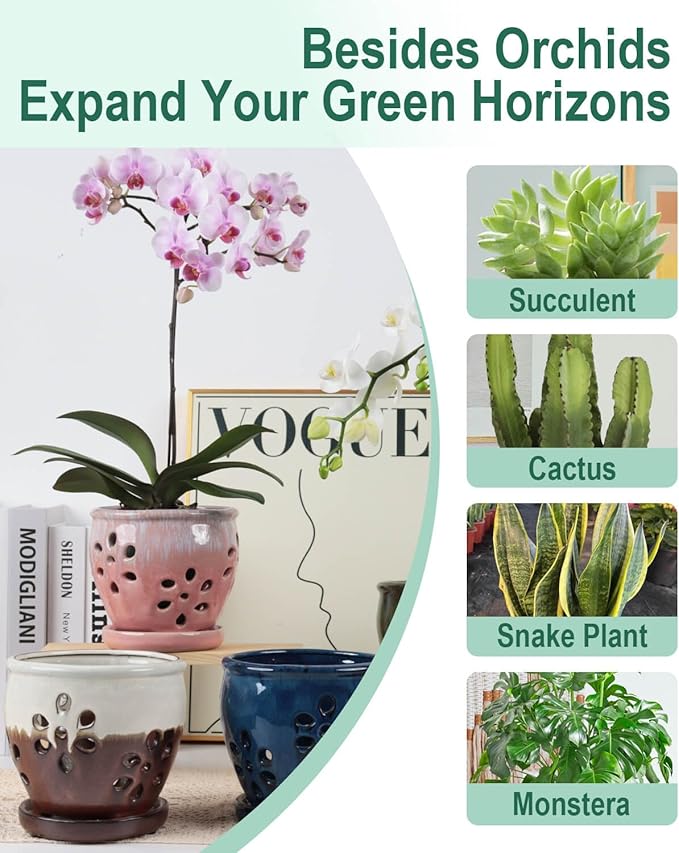 • 【 Perfect Air Flow and Drainage 】 The ceramic orchid pots side body have specially designed multiple holes for promotes air circulation and it has drainage hole in the bottom help for better drain and benefit for root grow healthy. Orchid pot with attached saucer could collect excess water keep your planting place cleaning.