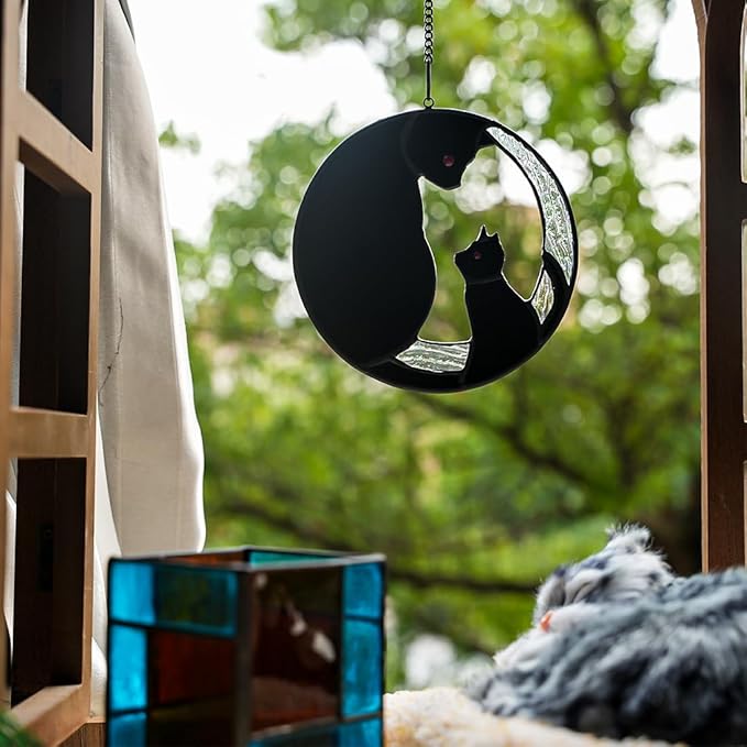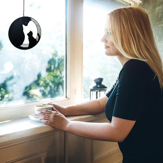 • CAT SUNCATCHER FOR WINDOW: The stained glass window hanging is timeless and never losing its luster like the love between you and your loved cat. The black cat stained glass window hangings makes the wonderful combination of visual interest and stunning artistry. Cat stained glass suncatcher can create some gorgeous and unique lighting patterns when the sun shines through them.