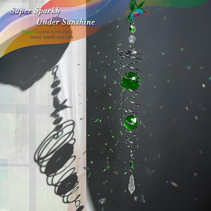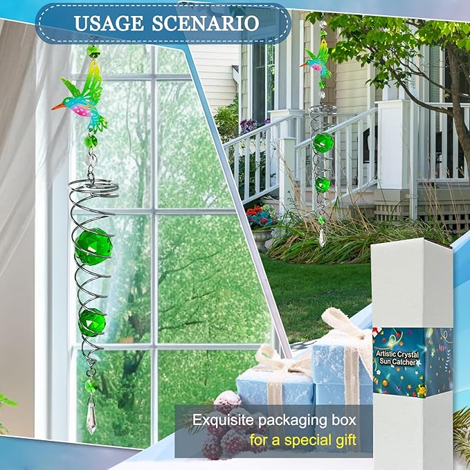 • 【HIGH QUALITY】:FONMY hummingbird Crystal wind spinner sun catcher is made of stainless steel wire with K9 crystal material, special double structure spiral tail w/ solid color K9 crystal glass ball,promised good weather resistant and amazing decoration. All FONMY crystal ball made of top crystal glass material with finely crafted, high clarity and cast beautiful rainbows, could turn the sun's rays into many rainbows.
