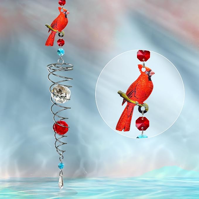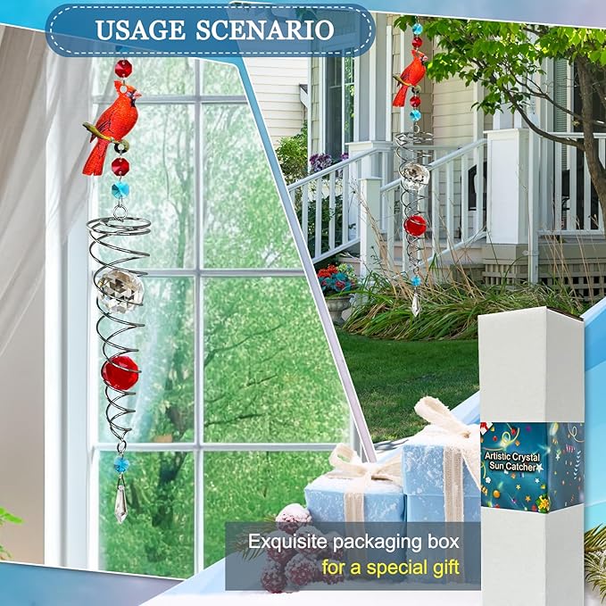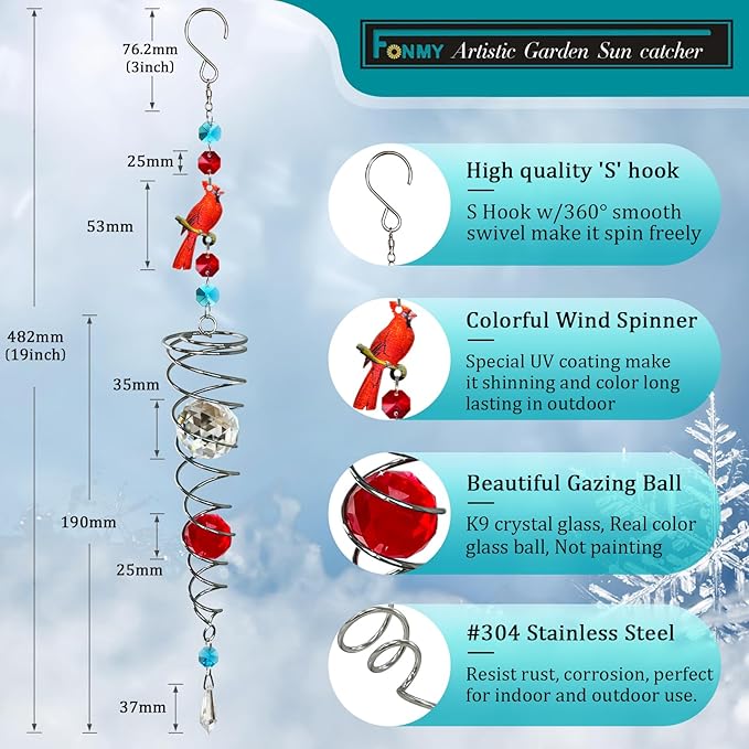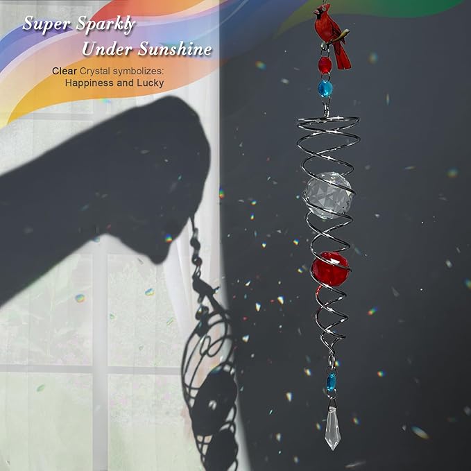 • 【HIGH QUALITY】:FONMY cardinal Crystal wind spinner sun catcher is made of stainless steel wire with K9 crystal material, special double structure spiral tail w/ solid color K9 crystal glass ball,promised good weather resistant and amazing decoration. All FONMY crystal ball made of top crystal glass material with finely crafted, high clarity and cast beautiful rainbows, could turn the sun's rays into many rainbows.