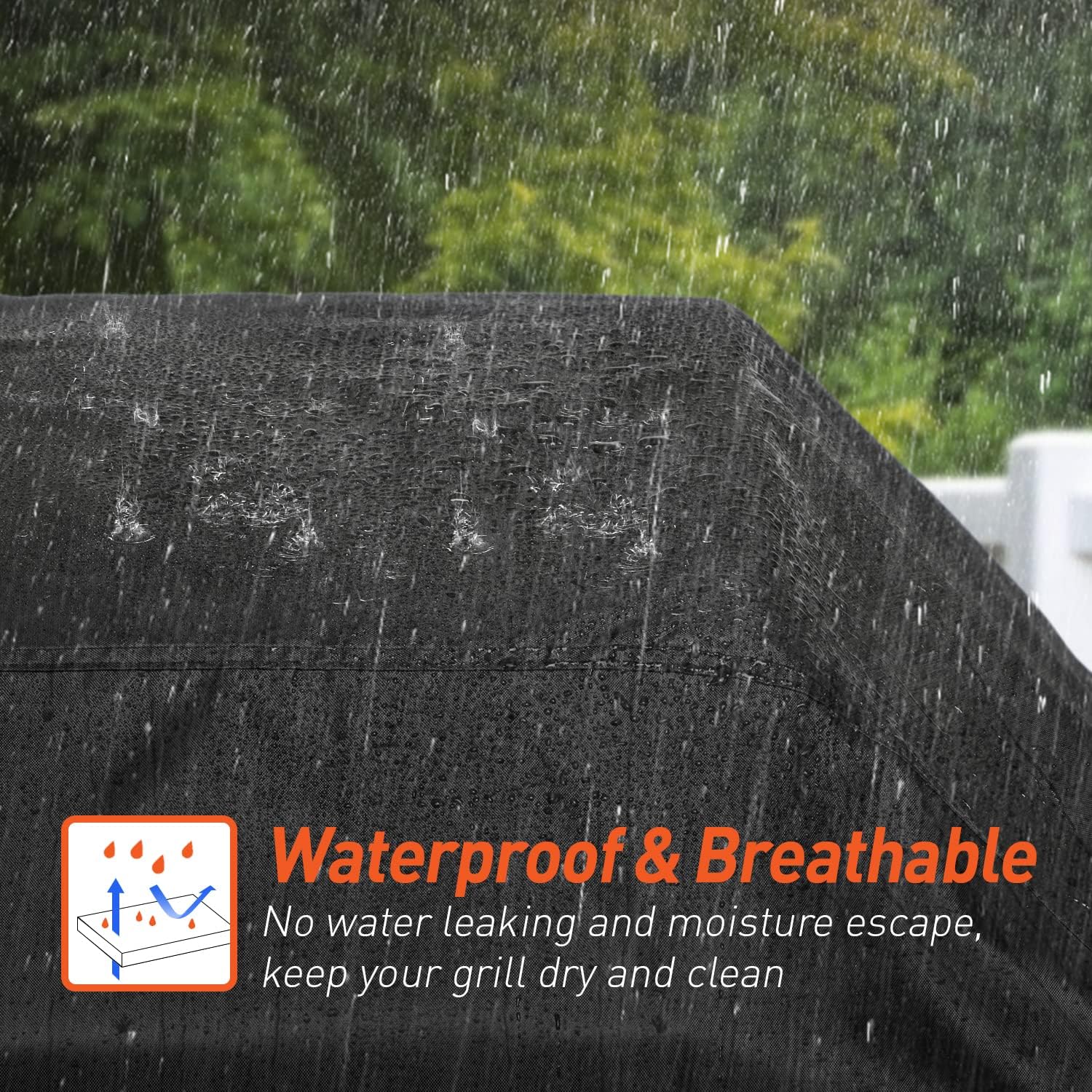 • 【Fade and Tear Resistant】- Made of solution-dyed Polyester fabric which is highly resistant to UV fading, provides exceptional durability to sunlight, the durable BBQ cover will not fade to gray in the sun, maintain its solid black color in any season. The high-density fabric is tear-resistant with double-stitched seams, tough enough to withstand all weather.