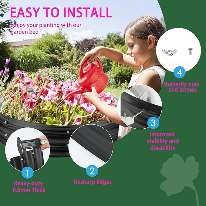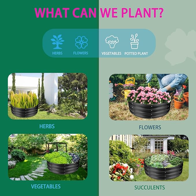 • 【STABLE】: This round raised garden bed is 32 IN Diameter,11.8 IN Tall, each is made of 0.8 MM thick Q195 galvanized metal sheet, double-layer anti-corrosion galvanizing and round structure design,it will provide a solid foundation for your plants