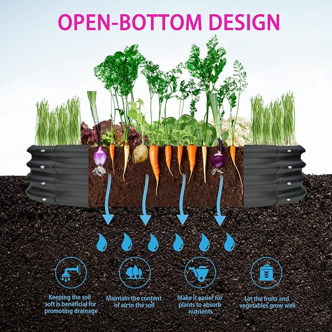 • 【OPEN BOTTOM】: This galvanized raised garden beds have open bottom design,which promotes healthy drainage and allows for deeper root growth, ensuring your plants thrive