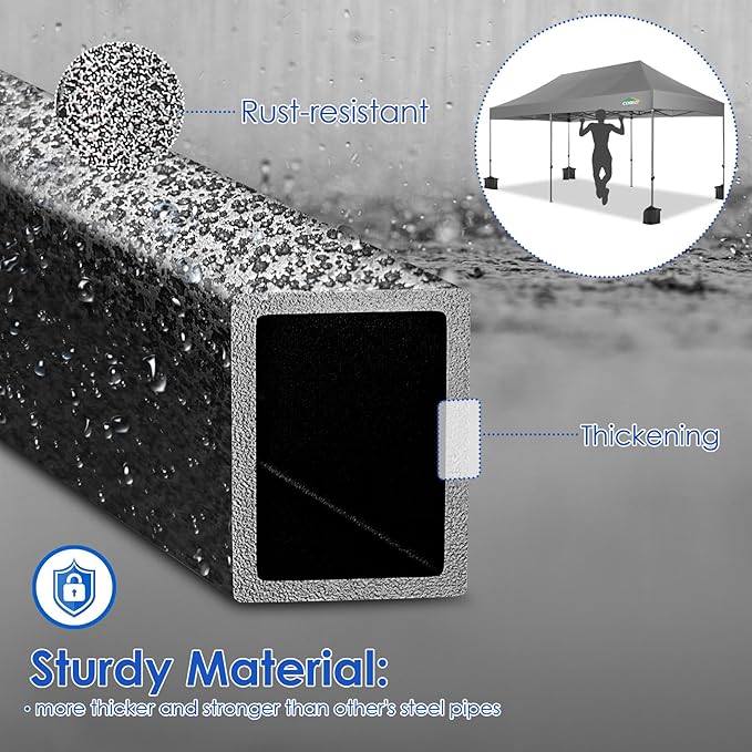 • ✦High Quality Frame Upgrade: High quality powder coated aluminum frame brings incredible strength to this heavy duty pop up canopy,at the same time rust and corrosion resistant. The newly upgraded 32mm steel tube diameter & 0.7mm wall thickness have significantly improved strength compared to other tents on the market and help to provide strong support, can carry up to the weight of 8 people at the same time. With sandbags and wind ropes,it can be stable in winds of 50 km/h.