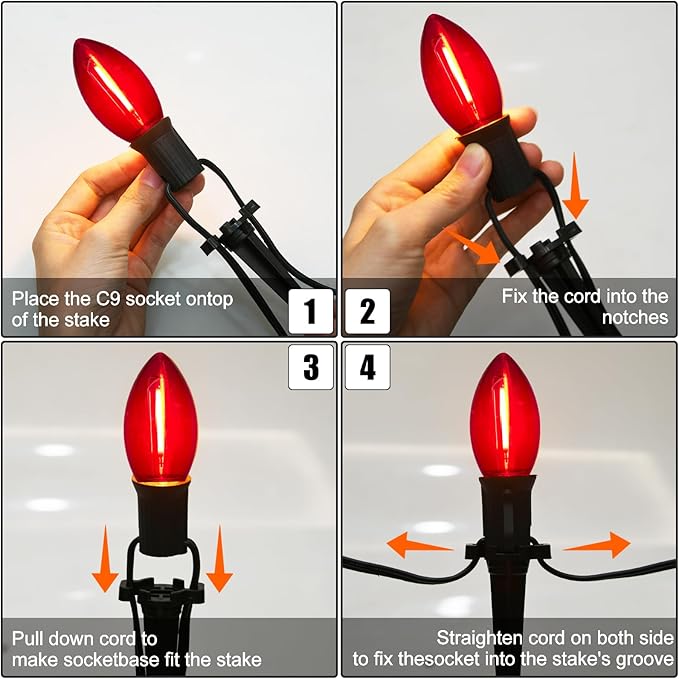 • SAFETY & ENERGY SAVING: Christmas Pavement Lights, 27pcs C9 coloured led bulbs (2 spare bulbs) fit E17/C9 base socket, 0.6W / bulb, 120V, Christmas passageway stake lights, UL approved, for indoor and outdoor decoration and lighting. If one bulb goes out does not affect the other bulbs.