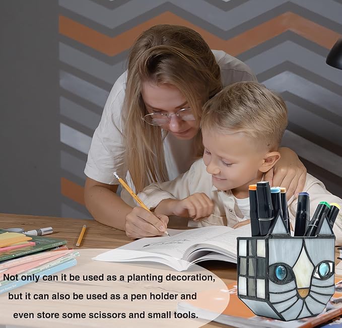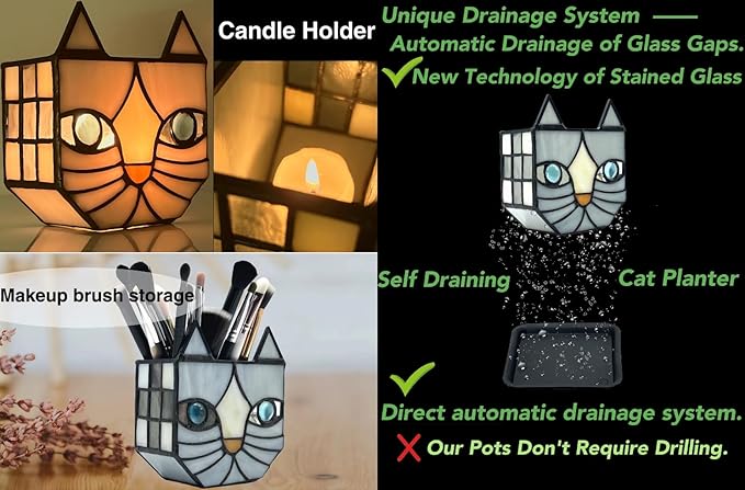 • Looking for a unique and beautiful way to display your plants;Tiffany's Adorable Cat Stained Glass Planter; Made with a corrosion resistant pure copper frame, these pots are not only functional but also beautiful. Each flower pot is handcrafted and can be used for planting, dried flower arrangement, candle holder, pen or cosmetic brush holder and so on. Perfect for decorating your dining table, living room, or anywhere else you want to add whimsy and charm