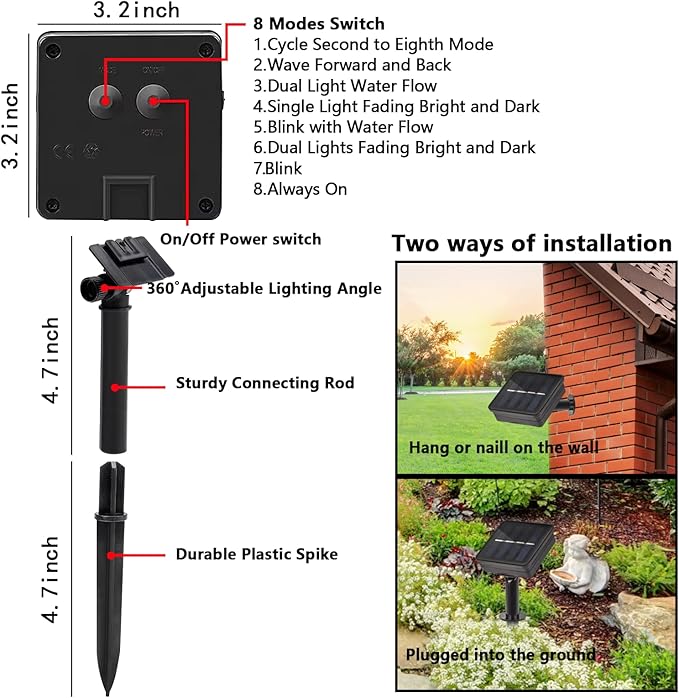 • 8 Modes Setting & Memory Function:The string lights for outside have an On/Off button and a Mode button, press the mode button to select 8 different modes to satisfy your diverse needs. The outdoor solar lights built-in memory function saves your last mode setting, eliminating the need to reset it every day.