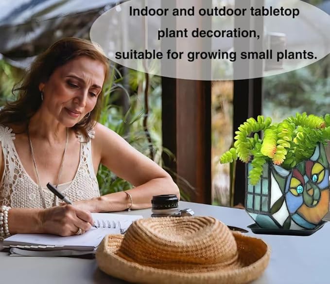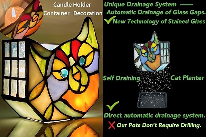 • MULTIFUNCTIONAL USE:Looking for a unique and beautiful way to display your plants ; Tiffany's Adorable Cat Stained Glass Planter;Made with a corrosion resistant pure copper frame; these pots are not only functional but also beautiful; Each flower pot is handcrafted and can be used for planting; dried flower arrangement; candle holder; pen or cosmetic brush holder and so on; Perfect for decorating your dining table; living room; or anywhere else you want to add whimsy and charm