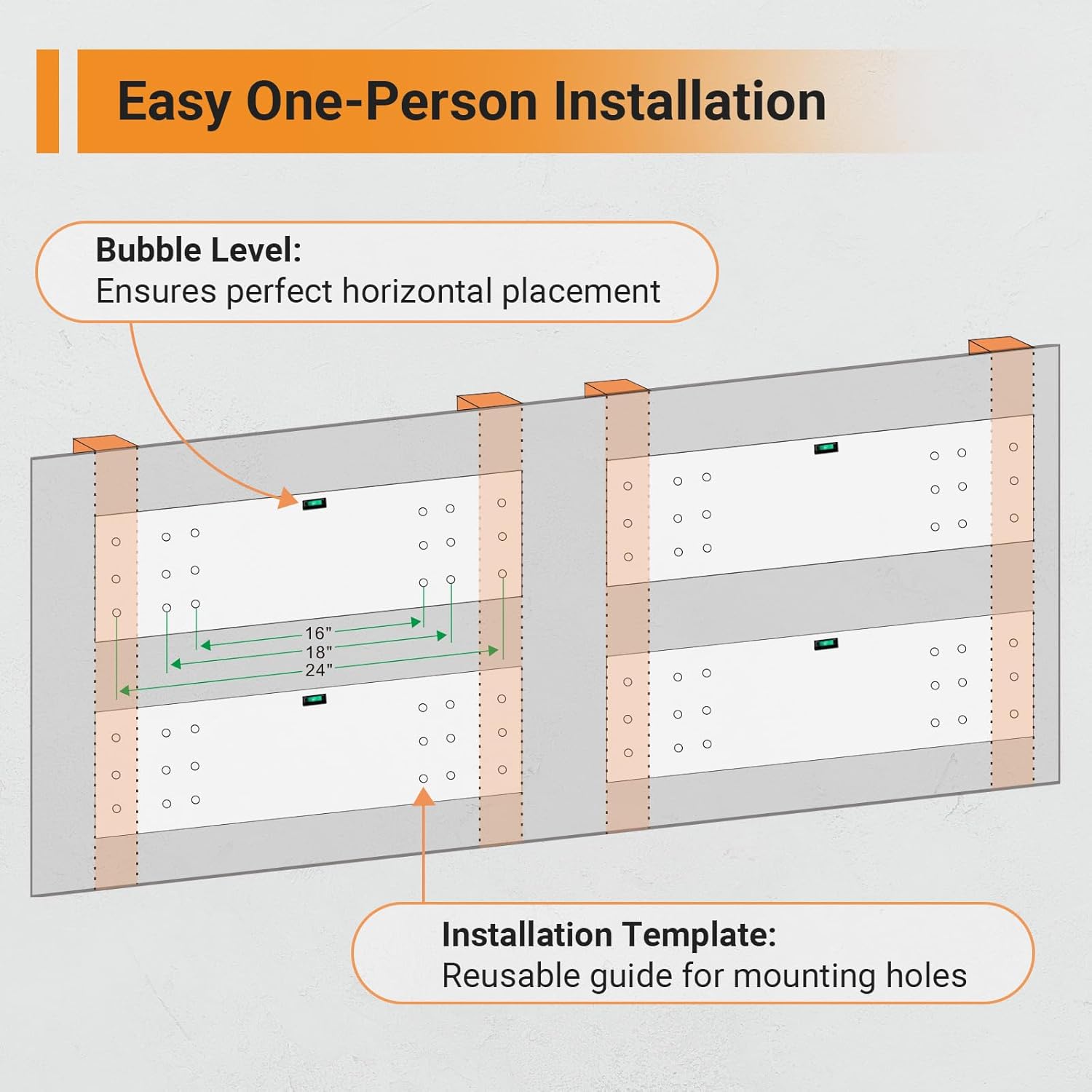 • Adjustable Spacing Design: Compatible with different stud spacing and wall types such as wood studs/joists and concrete walls (cannot be installed on metal walls) and can be used with wood stud spacing of 16", 18" or 24".