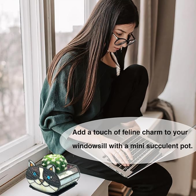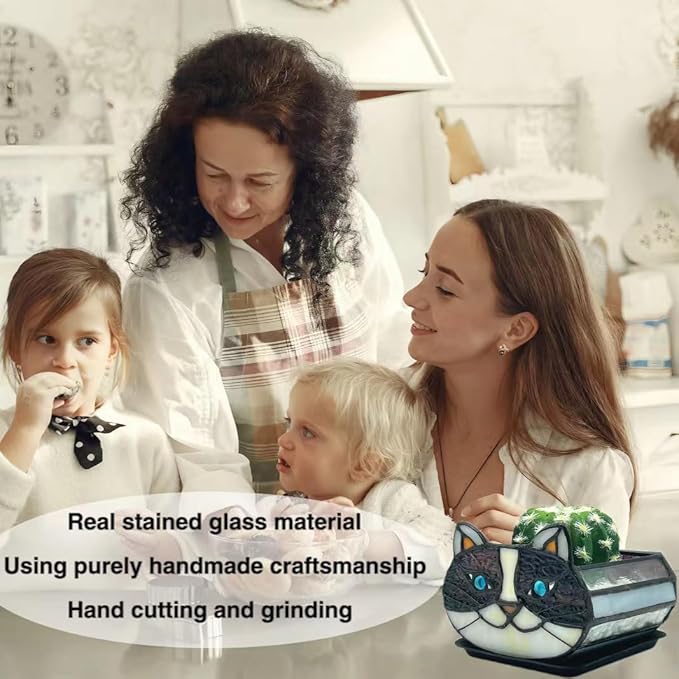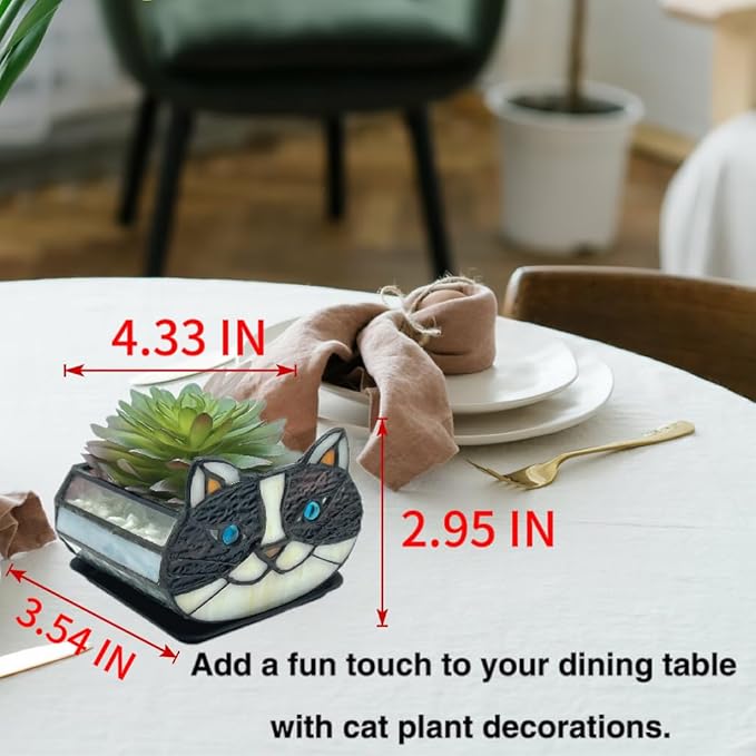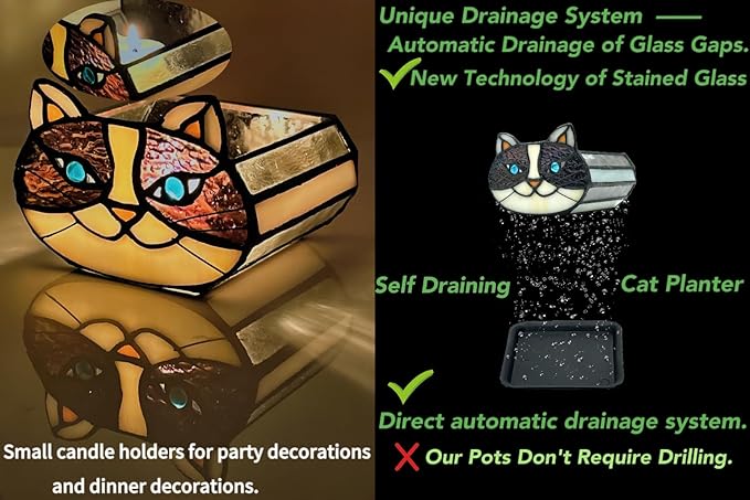 • Looking for a unique and beautiful way to display your plants;Tiffany's Adorable Cat Stained Glass Planter;Made with a corrosion-resistant pure copper frame, these pots are not only functional but also beautiful. Each flower pot is handcrafted and can be used for planting, dried flower arrangement, candle holder, pen or cosmetic brush holder and so on. Perfect for decorating your dining table, living room, or anywhere else you want to add whimsy and charm