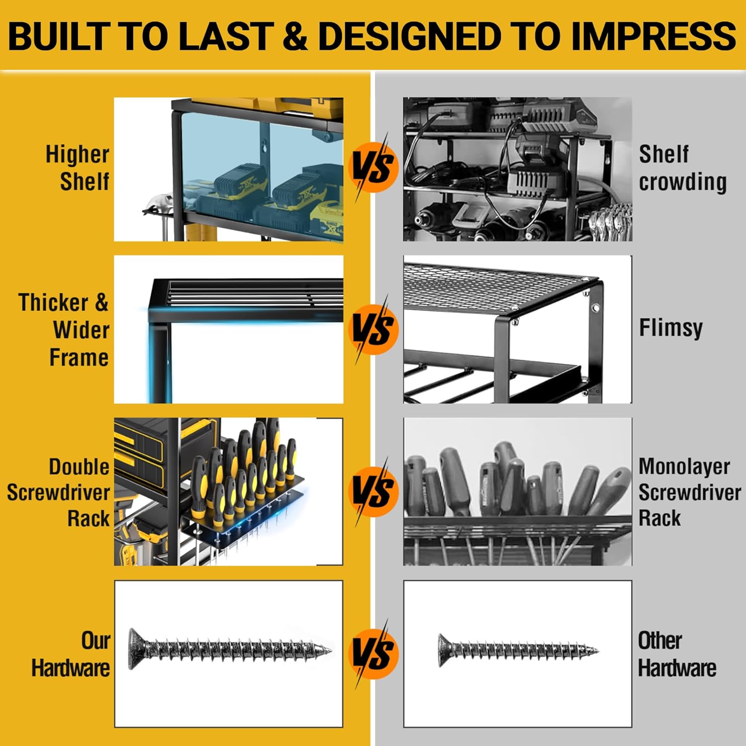 • 【HEAVY DUTY & DURABLE】:Most 3-tier tool rack on the market weigh only around 7 lbs, but we've upgraded ours to a solid 10.5 lbs by using thicker and stronger metal. This added weight means greater load capacity, improved stability, and longer-lasting durability — ideal for holding power tools without bending or wobbling over time.