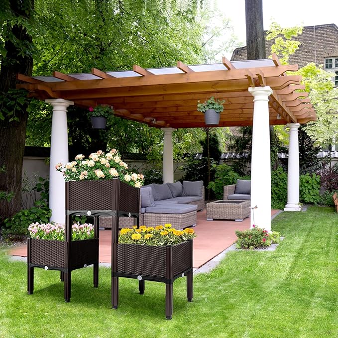 MAYOLIAH Raised Garden Bed with Drainage Elevated Planter Box Plastic Raised Beds for Gardening Vegetables Herb Flowers, Perfect for Indoor Outdoor Planting, 3 Boxes Brown