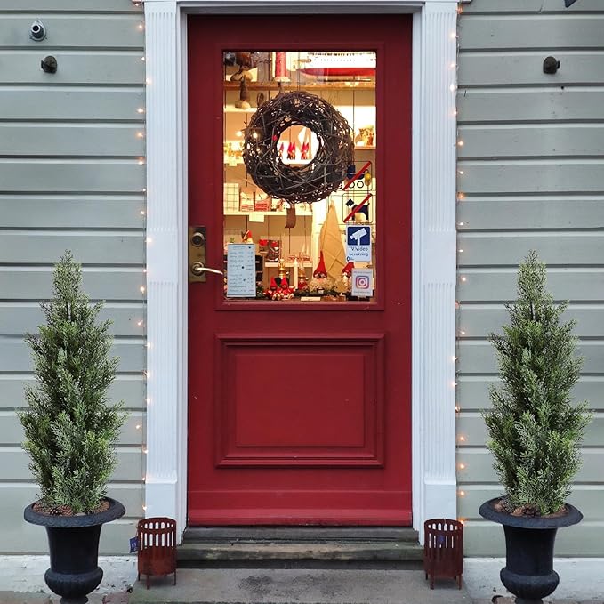 • Size:This Cedar Topiary Trees is 36 inch tall with black pot.You can match a different planter to the style of your home to make it look perfect. Due to slight compression deformation during packaging and transportation, please gently adjust the product shape by hand upon receipt.