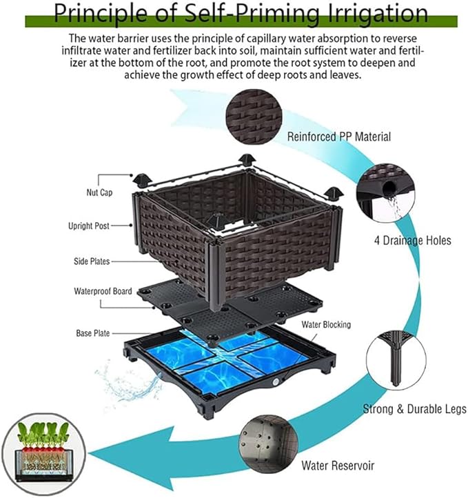 • 🌻【Durable Outdoor Growth Box】Our elevated planter boxes are made of reinforced PP material with a rattan pattern that is durable, lightweight, high load bearing, washable and reusable.