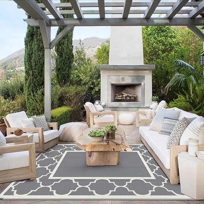 GENIMO 6' x 9' Outdoor Rug Waterproof for Patio Decor, Foldable Reversible Plastic Straw Area Rugs Mat for Camper, Outside Carpet for Rv, Deck, Porch, Picnic, Beach, Balcony, Grey & Beige White