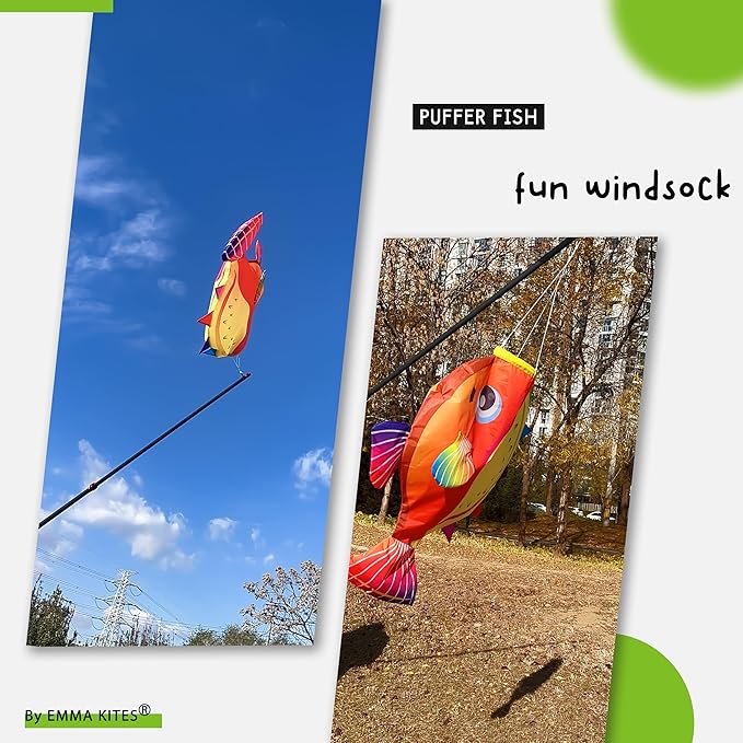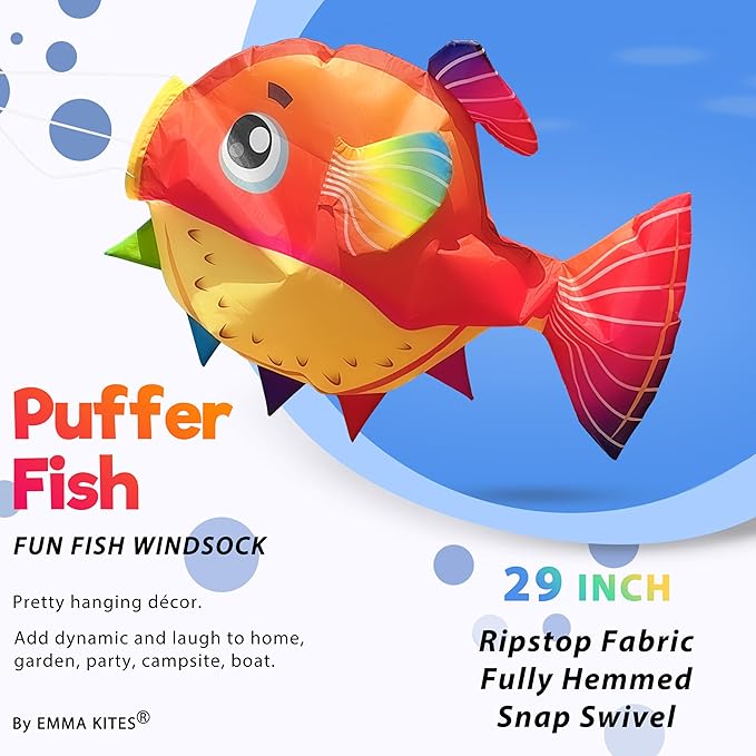 • emma kites 29-inches Puffer Fish Windsock easily catches your eye in the distance with its bright colors and vivid waves. The vibrant colors to brighten up your backyard, and a cute ocean friend to your family and neighbors, and to rise good days!