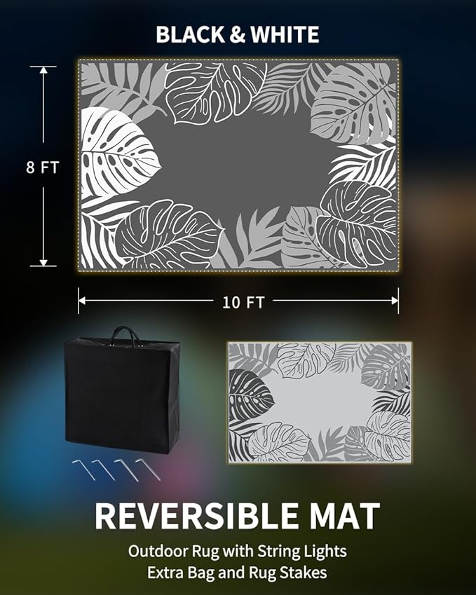 • RV traval&Camping: This camper must haves outdoor rug is ideal for picnics, gatherings, and RV trips! The lightweight outdoor camping carpet with foldable lines is easy to carry and saves space. Includes an extra carry bag and rug stakes for 6x9 ft, 8x10 ft and 9x12 ft. Grass-friendly, durable, and easy to clean, this outdoor rug enhances outdoor adventures.
