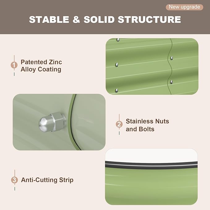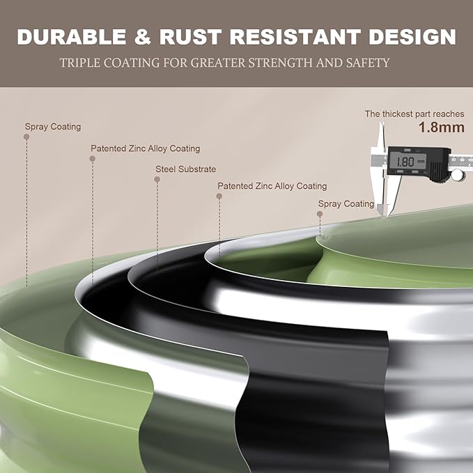 • DURABLE DESIGN: This galvanized raised garden bed, with a Zinc-Aluminum coating, is designed to enhance longevity and withstand various environmental conditions. The coating helps prevent oxidation and increases surface hardness. Its thickened design and oval shape ensure even pressure distribution, making it highly resilient against external forces. Reusable for years