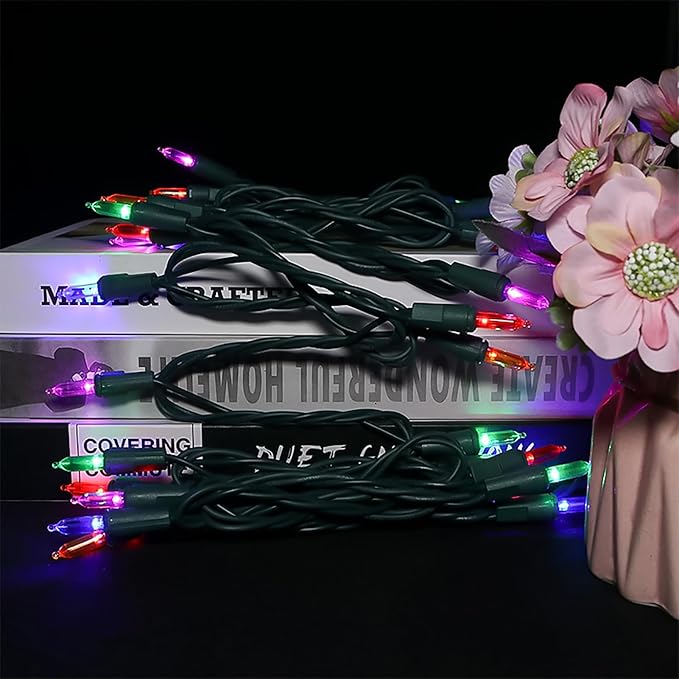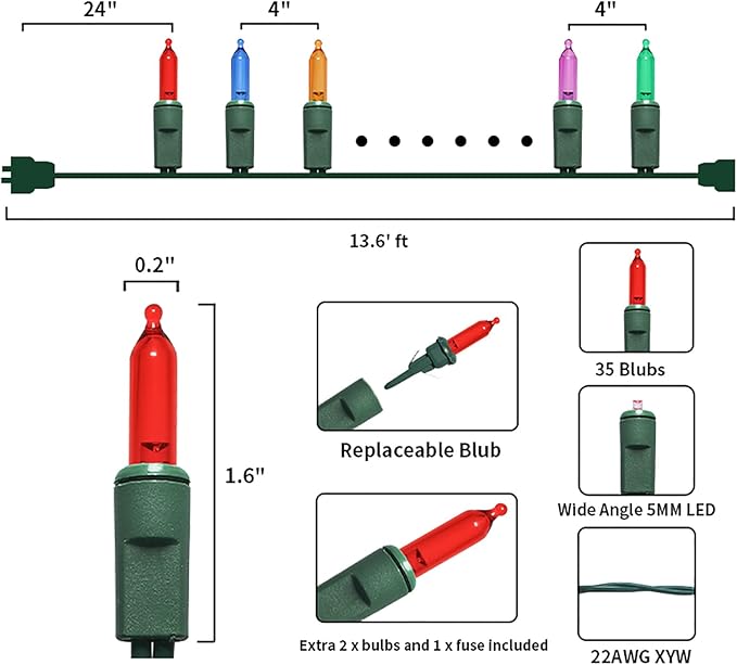 • 【Mini Christmas Lights Specification】: 1 Sets - green wire chritsmas light string includes 35 count multicolor LED lights, total length 13.6ft, lights length 11ft and each led is 4 inches apart, 24 inches lead wire, 4 inches end connector (Extra 2 x bulbs and 1 x fuse included)