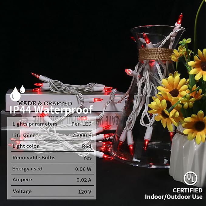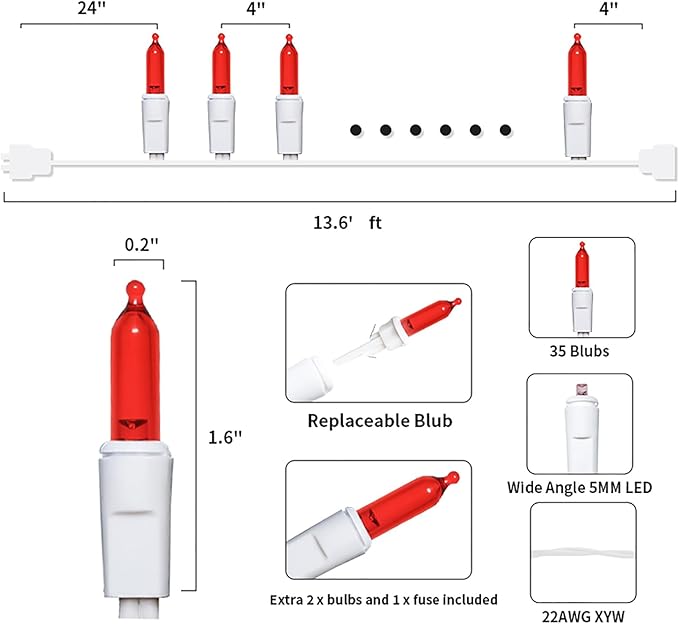 • 【Mini Christmas Lights Specification】: 1 Sets - white wire chritsmas light string includes 35 count red LED lights, total length 13.6ft, lights length 11ft and each led is 4 inches apart, 24 inches lead wire, 4 inches end connector (Extra 2 x bulbs and 1 x fuse included)