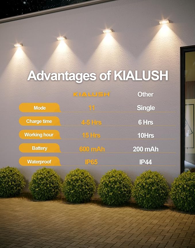 • 【600mAh Battery & Long Working Time】We equipped the outdoor solar wall lights with a built-in 600 mAh battery, which supports each outdoor solar light to light up continuously for more than 15 hours, and can guarantee the battery durability to meet the daily use of most families.