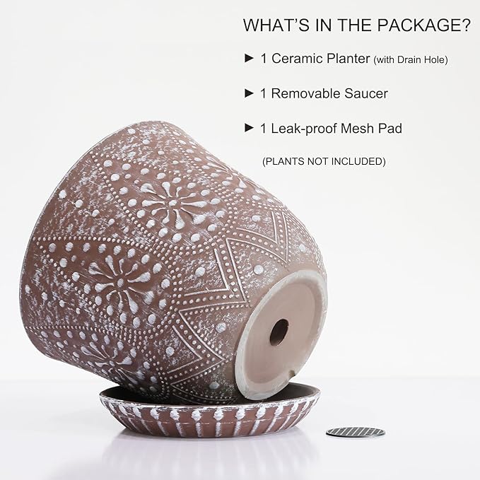 • Size & Package: 10 Inch Pot . Package: contains 1 ceramic flower pots, 1pcs mesh pads and 1pcs saucers(NOT INCLUDE PLANTS)